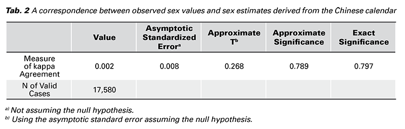 A kappa value of 0.002 and a p-value of 0.797 were determined in the study. The resulting kappa coefficient of 0.002 signifies that there is no statistically significant agreement between the “observed gender values” and the “gender predictions” derived from the Chinese calendar (Tab. 2).