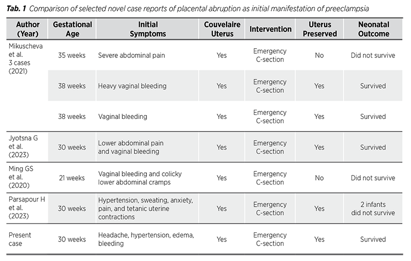 Table 1 presents a comparative summary of similar novel published case reports that document placental abruption as the initial manifestation of preeclampsia, highlighting differences in presentation, intervention, and outcomes.